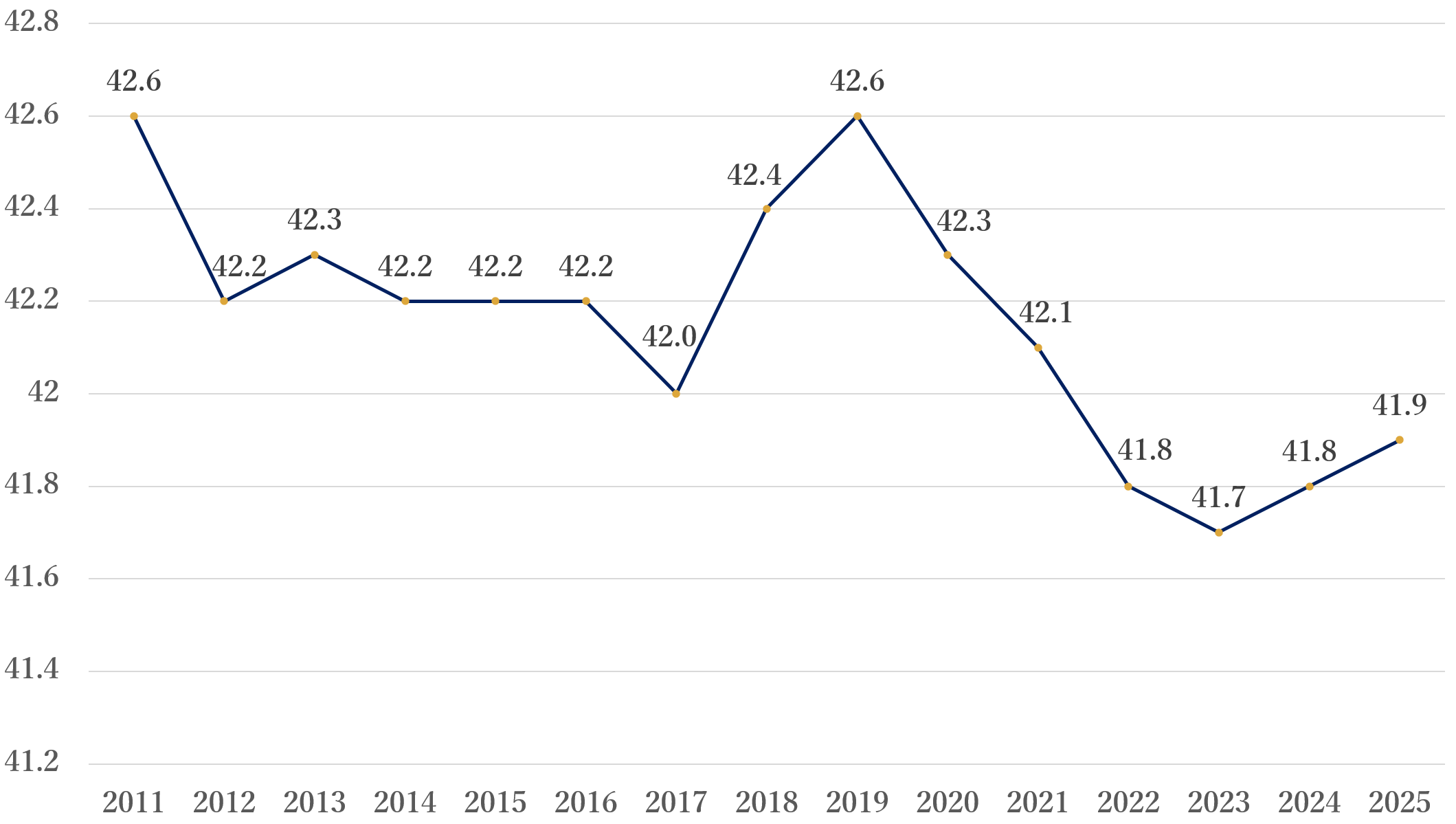 平均年齢(歳) 42.6  42.2  42.3  42.2  42.2  42.2  42.0  42.4  42.6  42.3  42.1  41.8  41.7  41.8  41.9